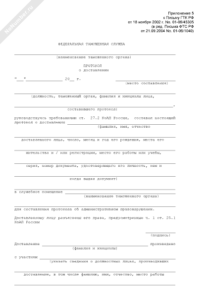 - 628Протокол о доставлении лица в служебное помещение таможенного органа для составления протокола об административном правонарушении
