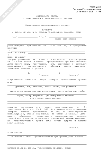 - 637Протокол о наложении ареста на товары, транспортные средства, вещи, составленный ввиду выявления административного правонарушения территориальными органами Россельхознадзора