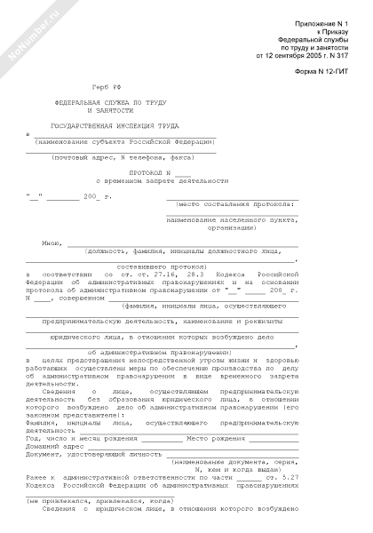 - 621Протокол о временном запрете деятельности на лицо, осуществляющее предпринимательскую деятельность без образования юридического лица (юридическое лицо), в отношении которого возбуждено дело об административном правонарушении в целях предотвращения непосредственной угрозы жизни и здоровью работающих. Форма № 12-ГИТ