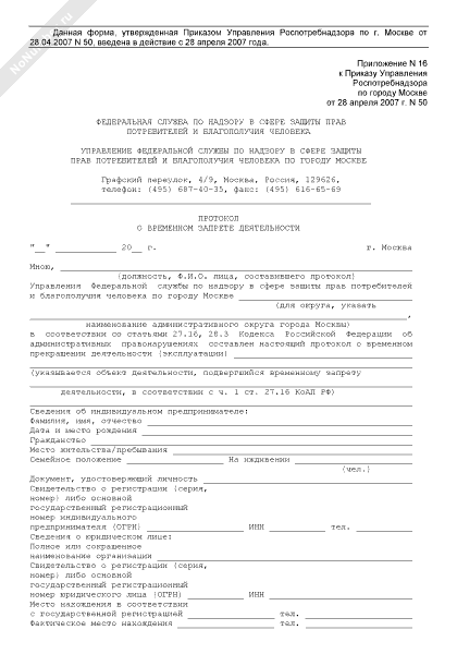 - 623Протокол о временном запрете деятельности в сфере защиты прав потребителей и благополучия человека по городу Москве