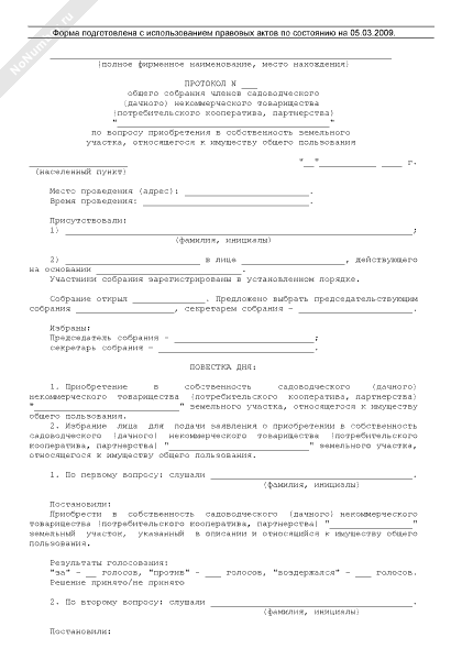 - 814Протокол общего собрания членов садоводческого (дачного) некоммерческого товарищества (потребительского кооператива, партнерства) по вопросу приобретения в собственность земельного участка, относящегося к имуществу общего пользования