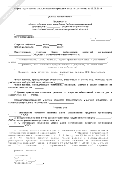 - 801Протокол общего собрания участников кредитной организации, созданной в форме общества с ограниченной ответственностью, об уменьшении уставного капитала