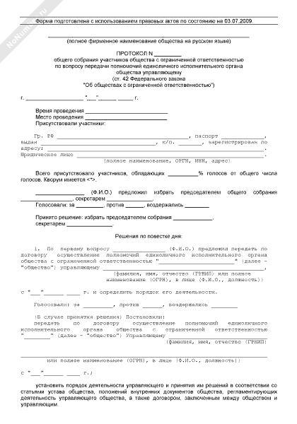 - 817Протокол общего собрания участников общества с ограниченной ответственностью по вопросу передачи полномочий единоличного исполнительного органа общества управляющему