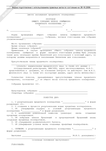 - 862Протокол общего собрания членов кредитного кооператива о реорганизации кредитного кооператива в форме разделения