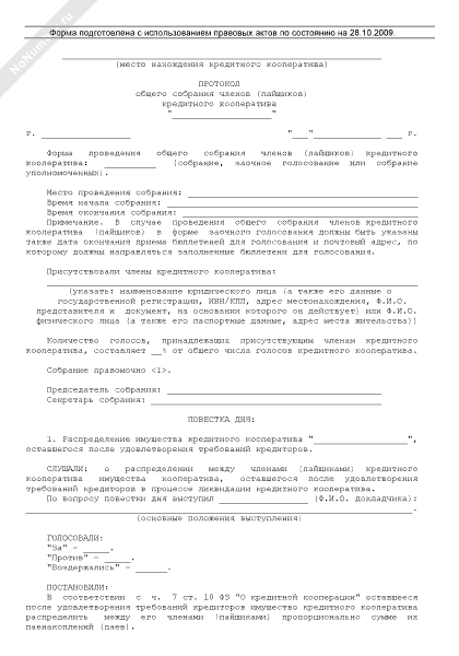 - 867Протокол общего собрания членов кредитного кооператива о распределении между членами кооператива имущества кооператива, оставшегося после удовлетворения требований кредиторов