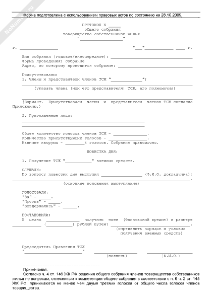 - 869Протокол общего собрания членов товарищества собственников жилья о принятии решения о получении заемных средств, в том числе банковских кредитов