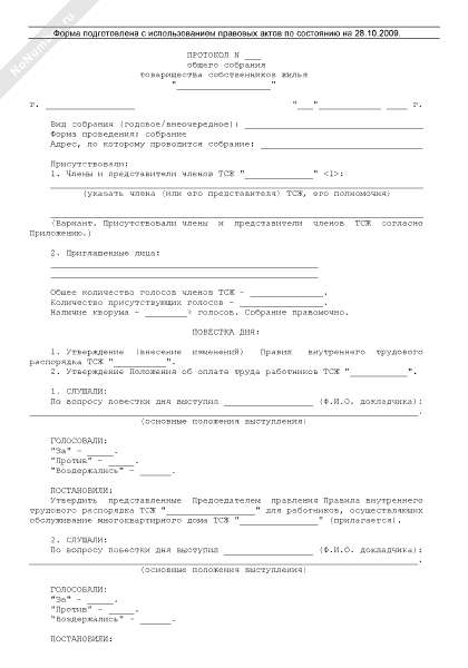 - 868Протокол общего собрания членов товарищества собственников жилья о принятии и изменении правил внутреннего распорядка товарищества в отношении работников, в обязанности которых входит обслуживание многоквартирного дома, положения об оплате их труда