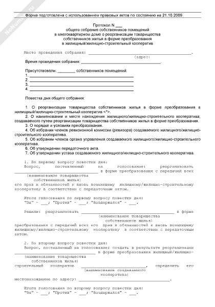 - 880Протокол общего собрания собственников помещений в многоквартирном доме о преобразовании товарищества собственников жилья в жилищный или жилищно-строительный кооператив