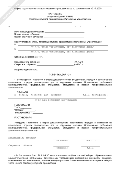 - 902Протокол общего собрания членов саморегулируемой организации арбитражных управляющих по вопросу утверждения мер дисциплинарного воздействия, порядка и оснований их применения, порядка рассмотрения дел о нарушении членами саморегулируемой организации требований законодательства, федеральных стандартов, стандартов и правил профессиональной деятельности