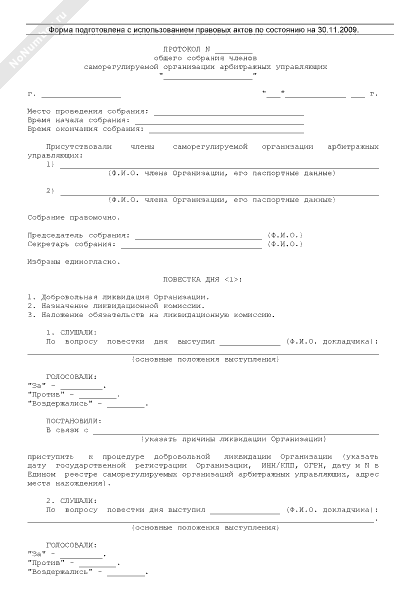 - 905Протокол общего собрания членов саморегулируемой организации арбитражных управляющих по вопросу принятия решений о добровольной ликвидации саморегулируемой организации, назначении ликвидационной комиссии