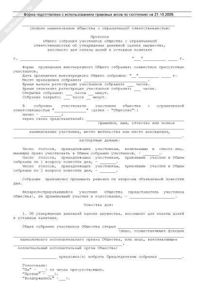 - 910Протокол общего собрания участников общества с ограниченной ответственностью об утверждении денежной оценки имущества, вносимого для оплаты долей в уставном капитале