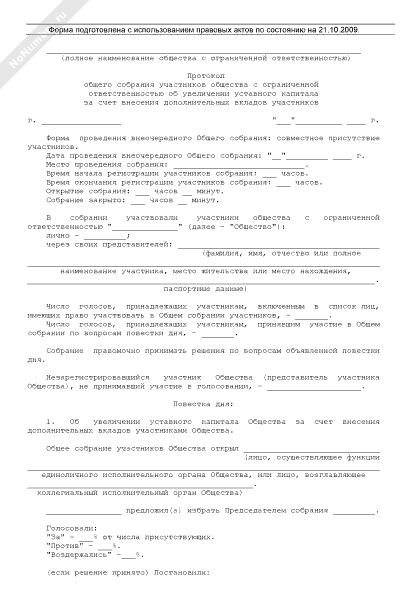 - 911Протокол общего собрания участников общества с ограниченной ответственностью об увеличении уставного капитала за счет внесения дополнительных вкладов участников