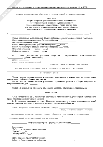 - 915Протокол общего собрания участников общества с ограниченной ответственностью о включении в устав положений, предусматривающих возможность участников общества или самого общества воспользоваться преимущественным правом покупки не всей доли или не всей части доли в уставном капитале, предлагаемых для продажи