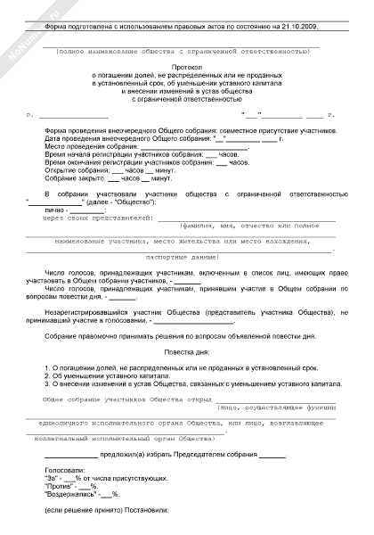 - 913Протокол общего собрания участников общества с ограниченной ответственностью об уменьшении уставного капитала