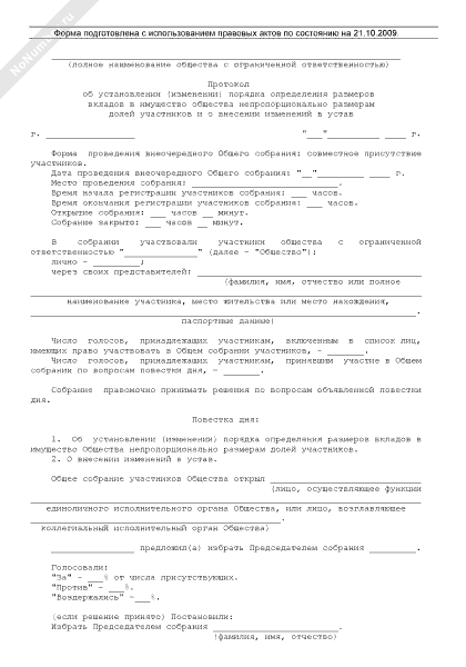 - 917Протокол общего собрания участников общества с ограниченной ответственностью об установлении (изменении) порядка определения размеров вкладов в имущество общества непропорционально размерам долей участников и о внесении изменений в устав