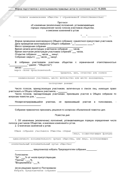 - 918Протокол общего собрания участников общества с ограниченной ответственностью об изменении (исключении) положений, устанавливающих порядок определения числа голосов участников общества, и внесении изменений в устав