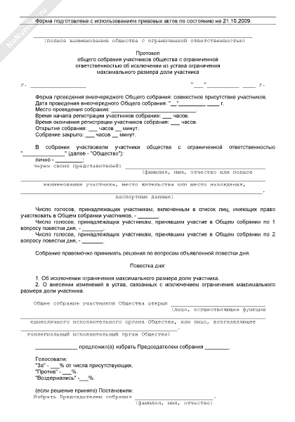 - 919Протокол общего собрания участников общества с ограниченной ответственностью об исключении из устава ограничения максимального размера доли участника