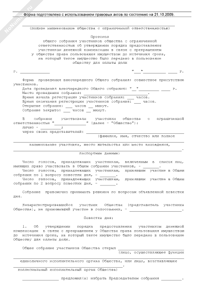 - 920Протокол общего собрания участников общества с ограниченной ответственностью об утверждении порядка предоставления участником денежной компенсации в связи с прекращением у общества права пользования имуществом до истечения срока, на который такое имущество было передано в пользование обществу для оплаты доли