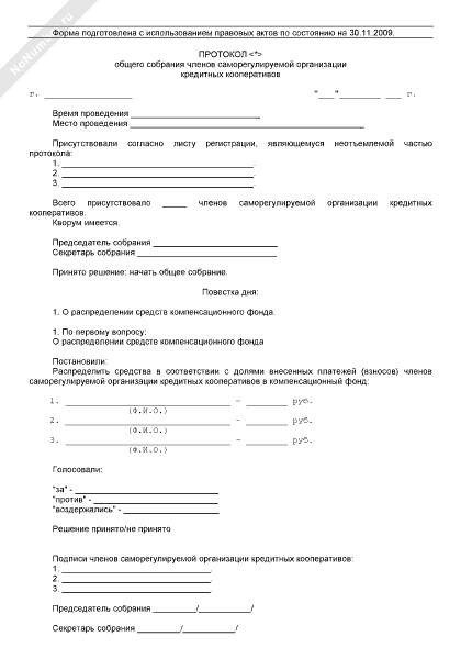 - 991Протокол общего собрания членов саморегулируемой организации кредитных кооперативов о распределении средств компенсационного фонда