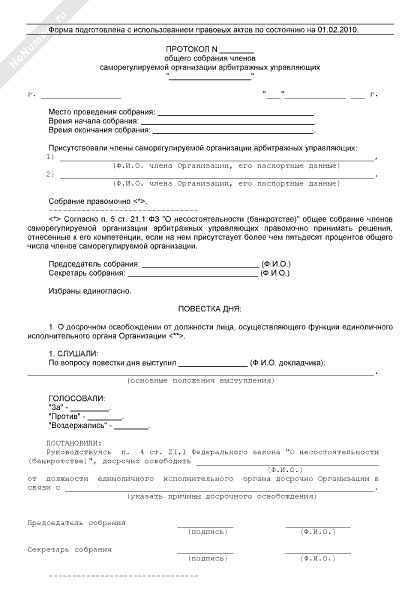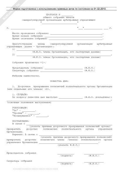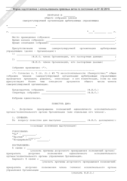 - 999Протокол общего собрания членов саморегулируемой организации арбитражных управляющих по вопросу о досрочном прекращении полномочий единоличного исполнительного органа/коллегиального органа организации (или отдельных его членов)