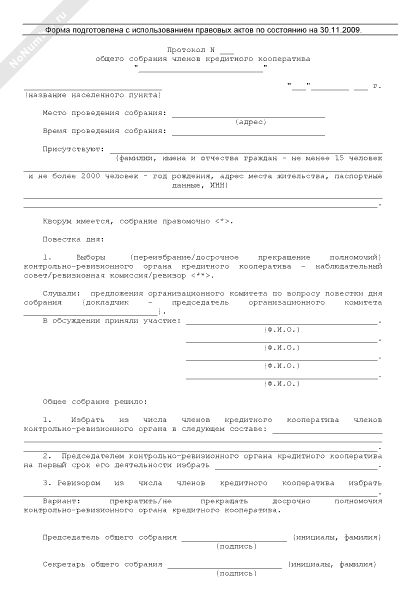 - 981Протокол общего собрания членов кредитного кооператива по вопросам избрания, переизбрания, досрочного прекращения полномочий контрольно-ревизионного органа (наблюдательного совета кредитного кооператива, ревизионной комиссии, ревизора) кредитного кооператива