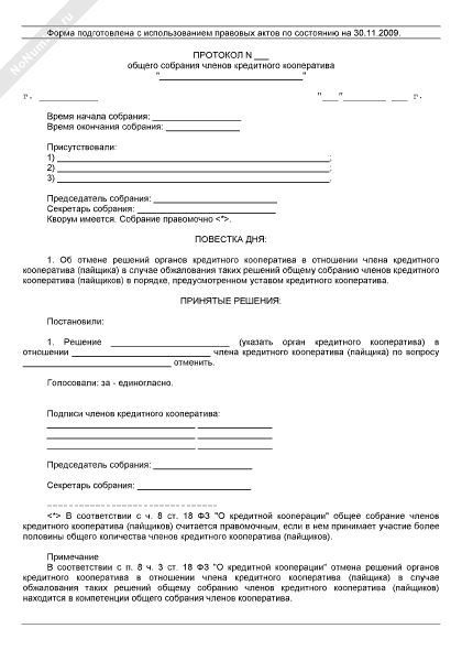 - 985Протокол общего собрания членов кредитного кооператива по вопросу отмены решений органов кредитного кооператива в отношении члена кредитного кооператива (пайщика) в случае обжалования таких решений общему собранию членов кредитного кооператива (пайщиков) в порядке, предусмотренном уставом кредитного кооператива