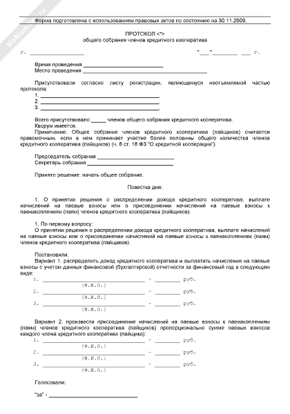- 986Протокол общего собрания членов кредитного кооператива по вопросу принятия решения о распределении дохода кредитного кооператива, выплате начислений на паевые взносы или о присоединении начислений на паевые взносы к паенакоплениям (паям) членов кредитного кооператива (пайщиков)