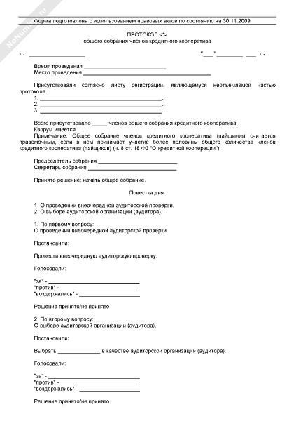 - 987Протокол общего собрания членов кредитного кооператива по вопросу принятия решения о проведении внеочередной аудиторской проверки и выбора аудиторской организации (аудитора)