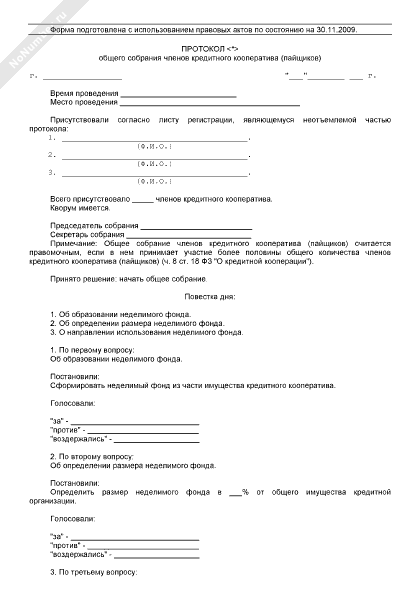 - 989Протокол общего собрания членов кредитного кооператива по вопросу образования неделимого фонда, определения размера неделимого фонда и направлений его использования