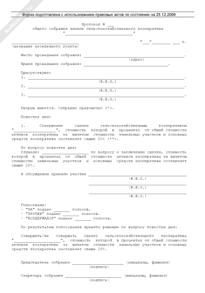 - 994Протокол общего собрания членов сельскохозяйственного кооператива по вопросу совершения кооперативом сделки, стоимость которой в процентах от общей стоимости активов кооператива за вычетом стоимости земельных участков и основных средств кооператива составляет свыше 20 процентов
