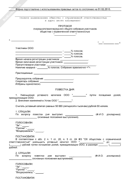 - 998Протокол общего собрания участников ООО об уменьшении уставного капитала путем погашения долей
