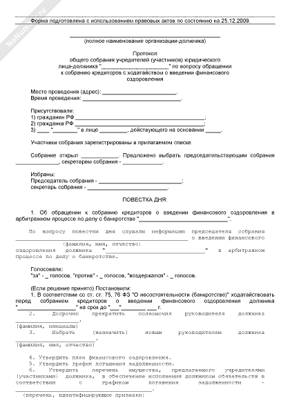 - 993Протокол общего собрания учредителей (участников) юридического лица-должника по вопросу обращения к первому собранию кредиторов с ходатайством о введении финансового оздоровления