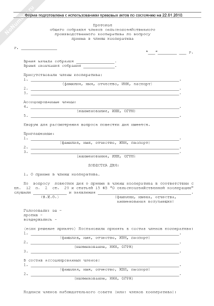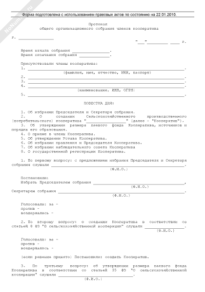 - 1001Протокол общего организационного собрания членов сельскохозяйственного кооператива