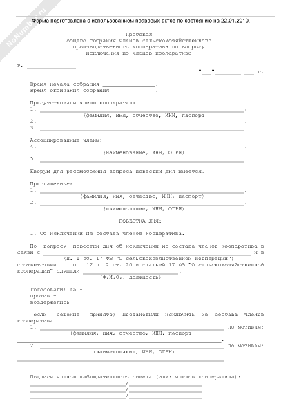 - 1019Протокол общего собрания членов сельскохозяйственного производственного кооператива по вопросу исключения из членов кооператива