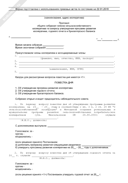 - 1004Протокол общего собрания членов сельскохозяйственного кооператива по вопросу утверждения программ развития кооператива, годового отчета и бухгалтерского баланса