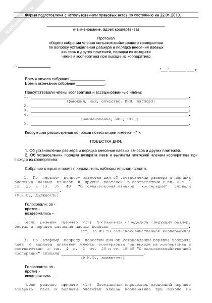 - 1005Протокол общего собрания членов сельскохозяйственного кооператива по вопросу установления размера и порядка внесения паевых взносов и других платежей, порядка их возврата членам кооператива при выходе из кооператива
