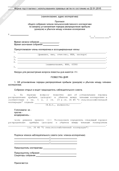 - 1006Протокол общего собрания членов сельскохозяйственного кооператива по вопросу установления порядка распределения прибыли (доходов) и убытков между членами кооператива