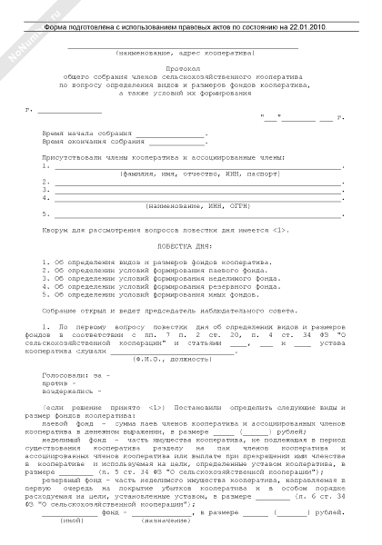 - 1007Протокол общего собрания членов сельскохозяйственного кооператива по вопросу определения видов и размеров фондов кооператива, а также условий их формирования