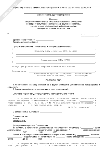 - 1008Протокол общего собрания членов сельскохозяйственного кооператива по вопросу вступления кооператива в другие кооперативы, хозяйственные товарищества и общества, союзы, ассоциации, а также выход из них