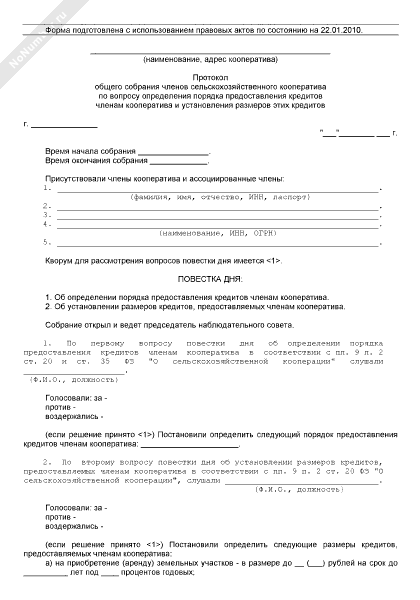 - 1009Протокол общего собрания членов сельскохозяйственного кооператива по вопросу определения порядка предоставления кредитов членам кооператива и установления размеров этих кредитов