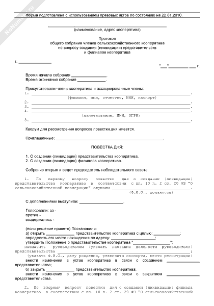 - 1010Протокол общего собрания членов сельскохозяйственного кооператива по вопросу создания и ликвидации представительств и филиалов кооператива