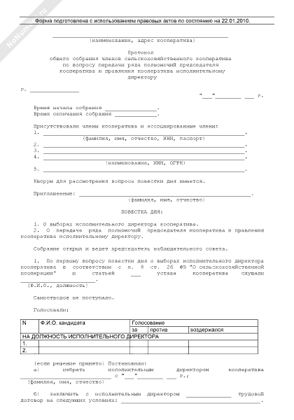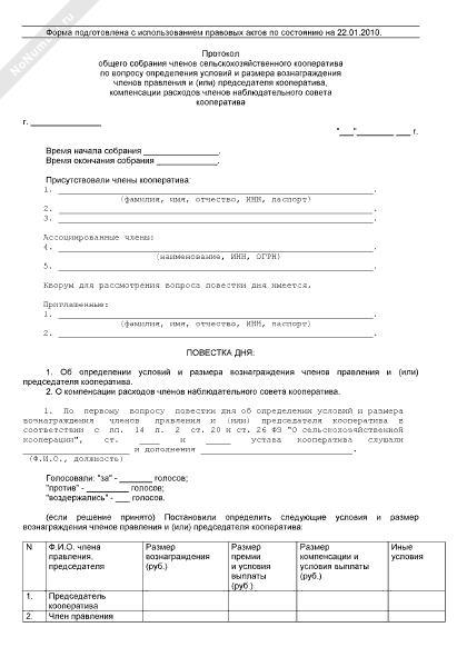 - 1012Протокол общего собрания членов сельскохозяйственного кооператива по вопросу определения условий и размера вознаграждения членов правления и (или) председателя кооператива, компенсации расходов членов наблюдательного совета кооператива