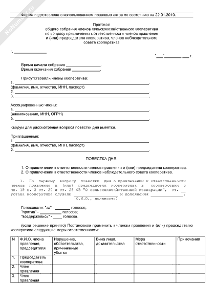 - 1013Протокол общего собрания членов сельскохозяйственного кооператива по вопросу привлечения к ответственности членов правления и (или) председателя кооператива, членов наблюдательного совета кооператива
