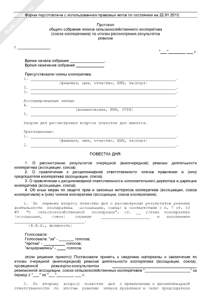 - 1016Протокол общего собрания членов сельскохозяйственного кооператива (союза кооперативов) по итогам рассмотрения результатов ревизии