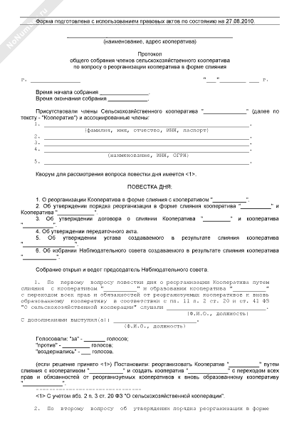 - 1011Протокол общего собрания членов сельскохозяйственного кооператива по вопросу о реорганизации кооператива в форме слияния