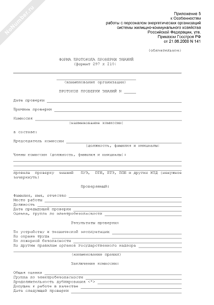 - 1177Протокол проверки знаний (ПУЭ, ПТБ, ПТЭ, ППБ и других НТД) персонала энергетических организаций системы жилищно-коммунального хозяйства Российской Федерации