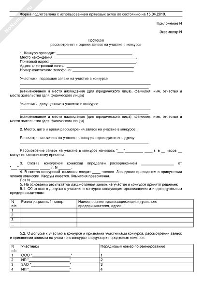 - 1247Протокол рассмотрения и оценки заявок на участие в конкурсе (приложение к конкурсной документации по проведению открытого конкурса на право размещения платежных терминалов самообслуживания)