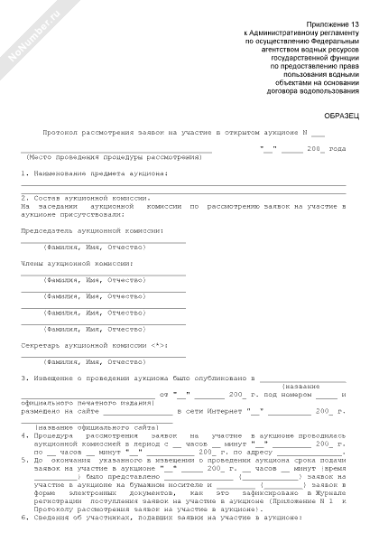 - 1245Протокол рассмотрения заявок на участие в открытом аукционе на право заключения договора водопользования