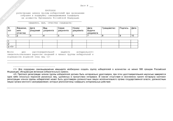 - 1253Протокол регистрации членов группы избирателей при проведении собрания в поддержку самовыдвижения кандидата на должность Президента Российской Федерации