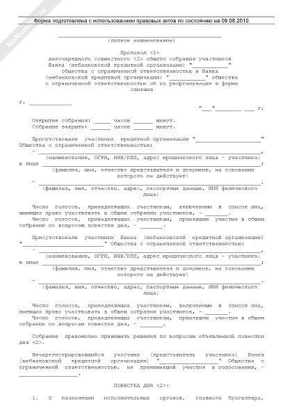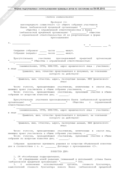 - 1340Протокол совместного общего собрания участников кредитных организаций, созданных в форме обществ с ограниченной ответственностью, по вопросу реорганизации в форме присоединения